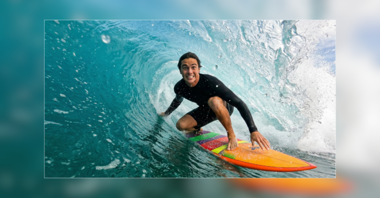 Camera: Shot on a high-speed water camera (GoPro Hero 12 style), wide-angle lens, sharp focus on the surfer.