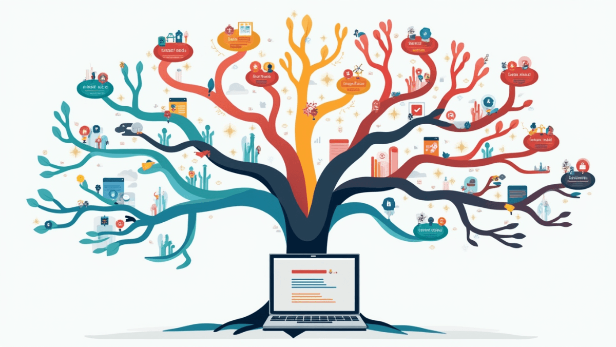 "Ilustração moderna mostrando um grande mapa mental ou árvore de decisão com diferentes caminhos coloridos, cada um representando um tipo diferente de prompt do chatgpt.