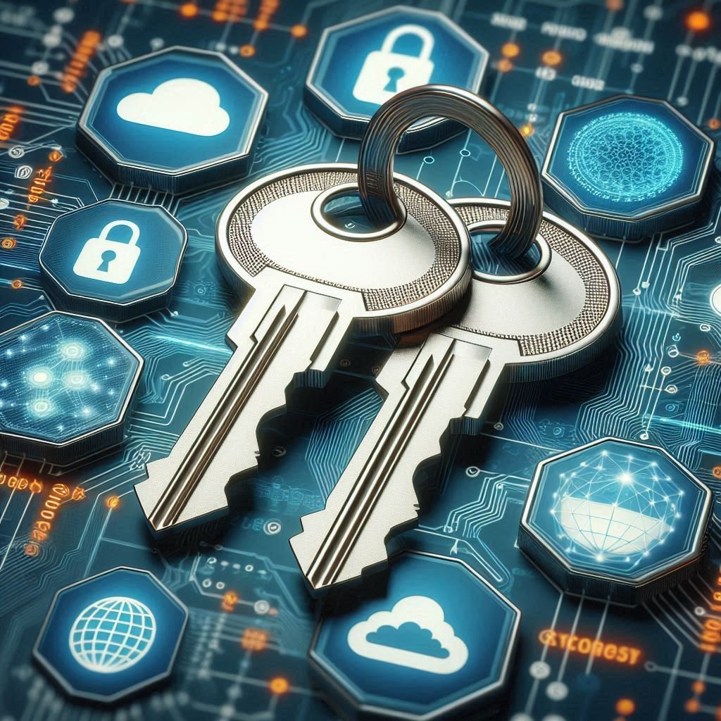 Imagem de 2 chaves, uma ao lado da outra, ao fundo com símbolos de criptografia, segurança, nuvem e um cadeado. A imagem ilustra a segurança da ativação da autenticação em 2 fatores.