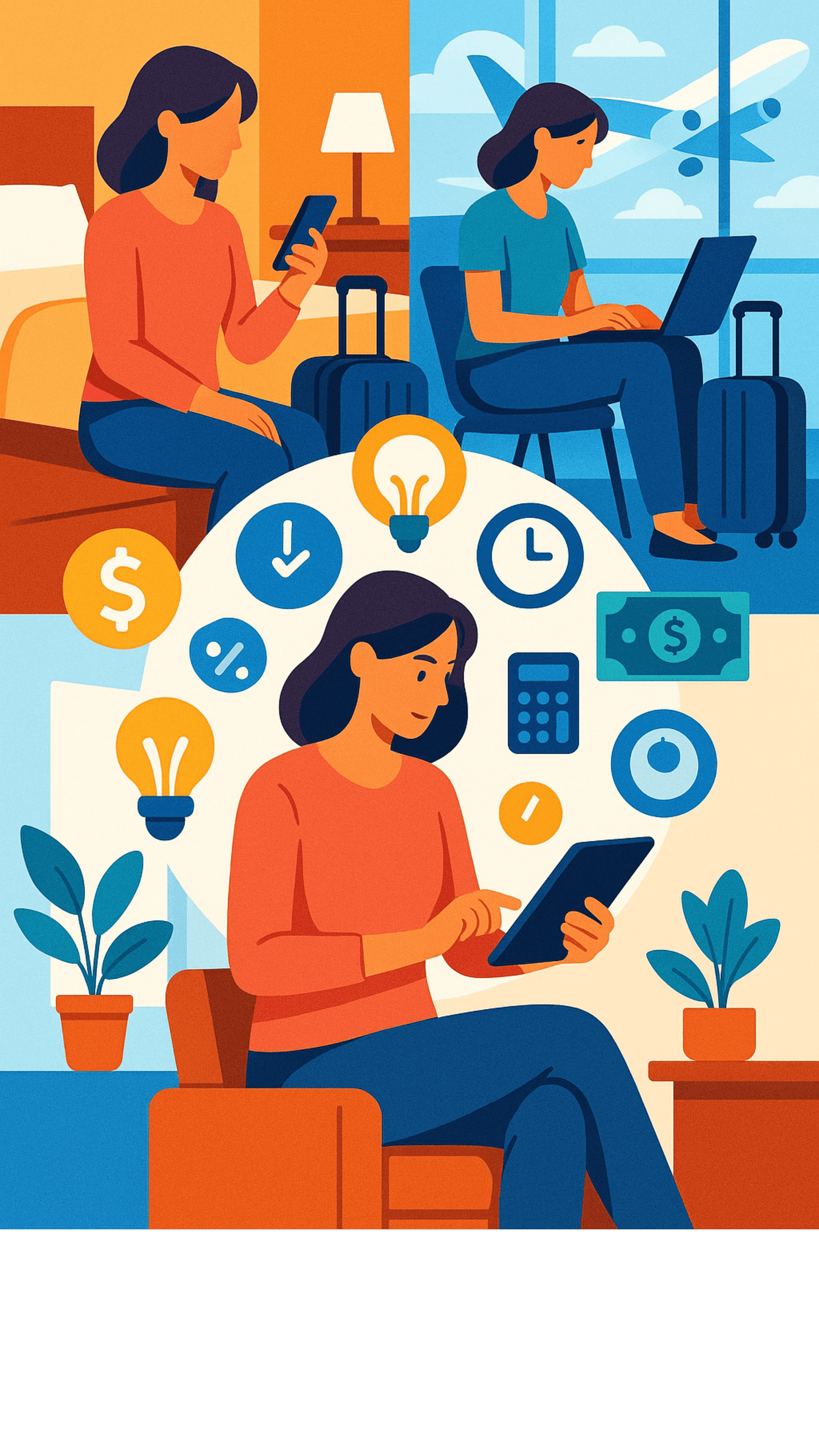 Montagem conceitual de uma pessoa viajando com mala, usando aparelhos eletrônicos em diferentes ambientes (quarto de hotel, aeroporto, casa), com pequenos ícones de economia e praticidade flutuando, estilo ilustração moderna com cores vibrantes.