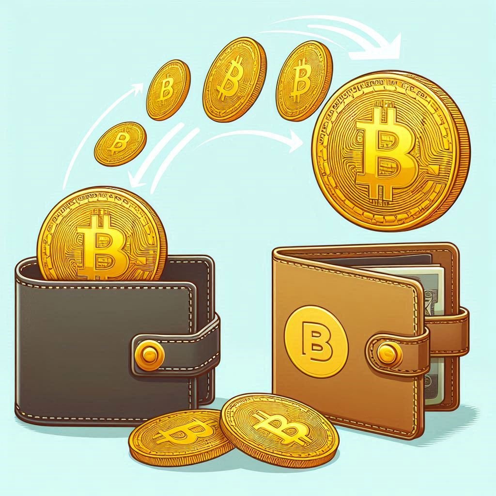 Uma moeda de bitcoin saindo de uma carteira e indo para outra carteira, ilustrando uma transferencia.